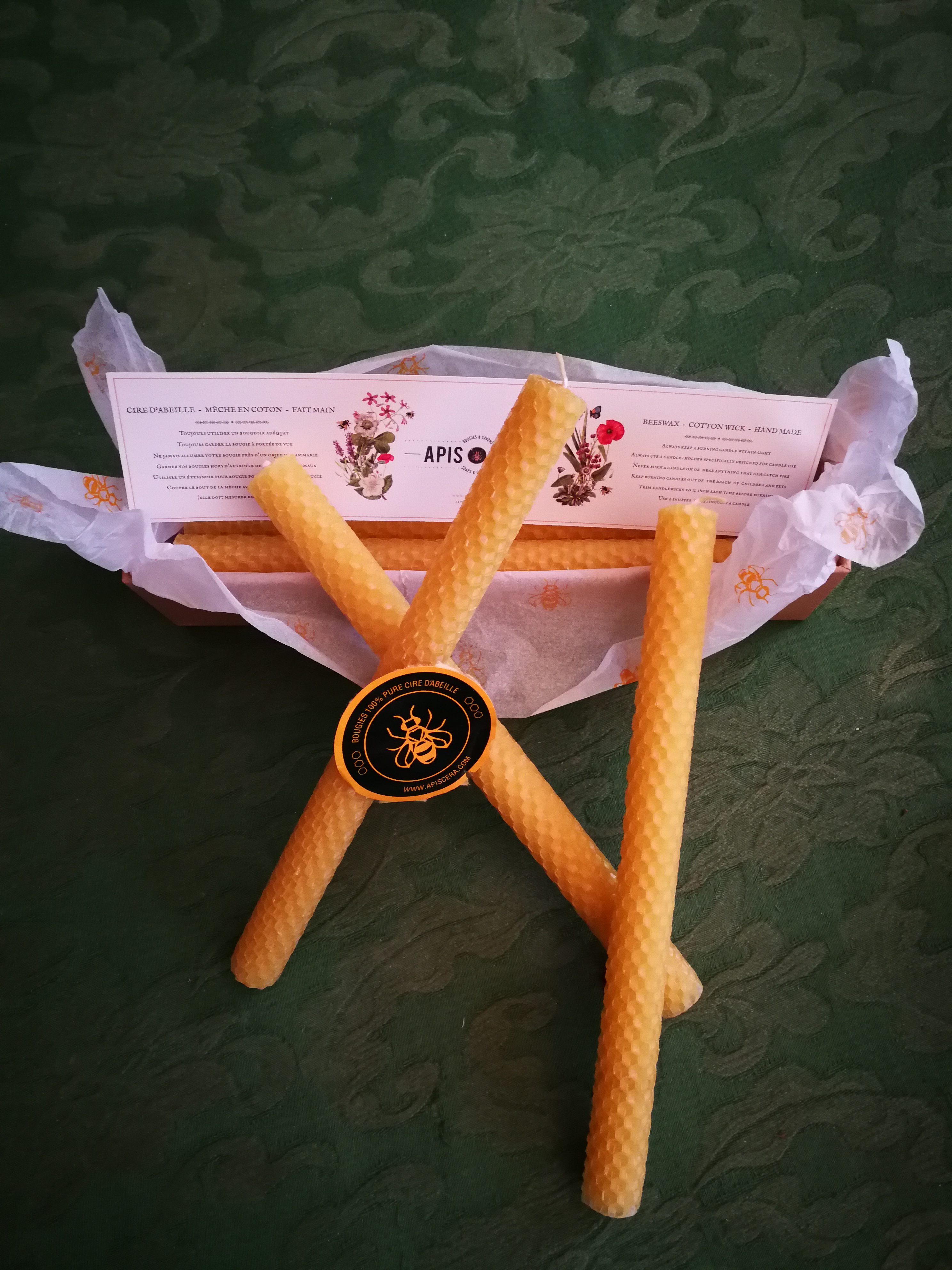 A ce jour, j’ai deux tailles de bougies. La première a pour nom Lucienne, en référence à son étymologie« lux » signifiant « lumière » en latin. Elle est réalisée en cire d’abeille gaufrée, roulée sur une mèche en pur coton. Et, cette cire que j’utilise pour fabriquer la bougie, a obtenu la médaille d’or au congrès apicole mondial Apimondia. (Référence mondiale des qualités de cire). Et la deuxième bougie s’appelle Ambroise, en référence à l’évêque de Milan et saint patron des apiculteurs Saint Ambroise (c. 340 – 397).