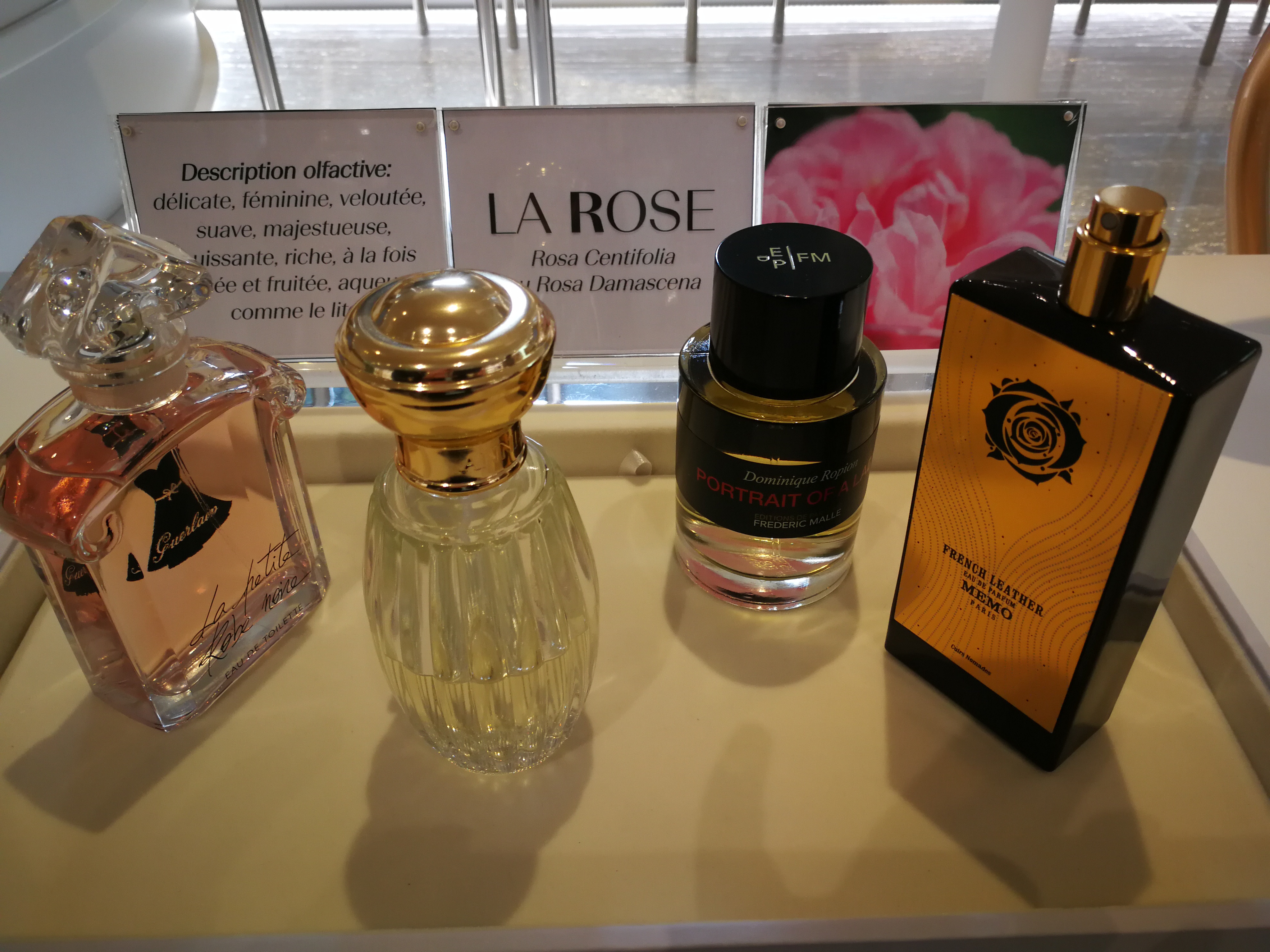 Continuons notre visite de la boutique du Grand Musée du Parfum….Toujours sur le thème des matières premières, la boutique a mis en place de petits plateaux sur la rose : l’histoire de la rose sera contée par une sélection de parfum autour de la rose.
