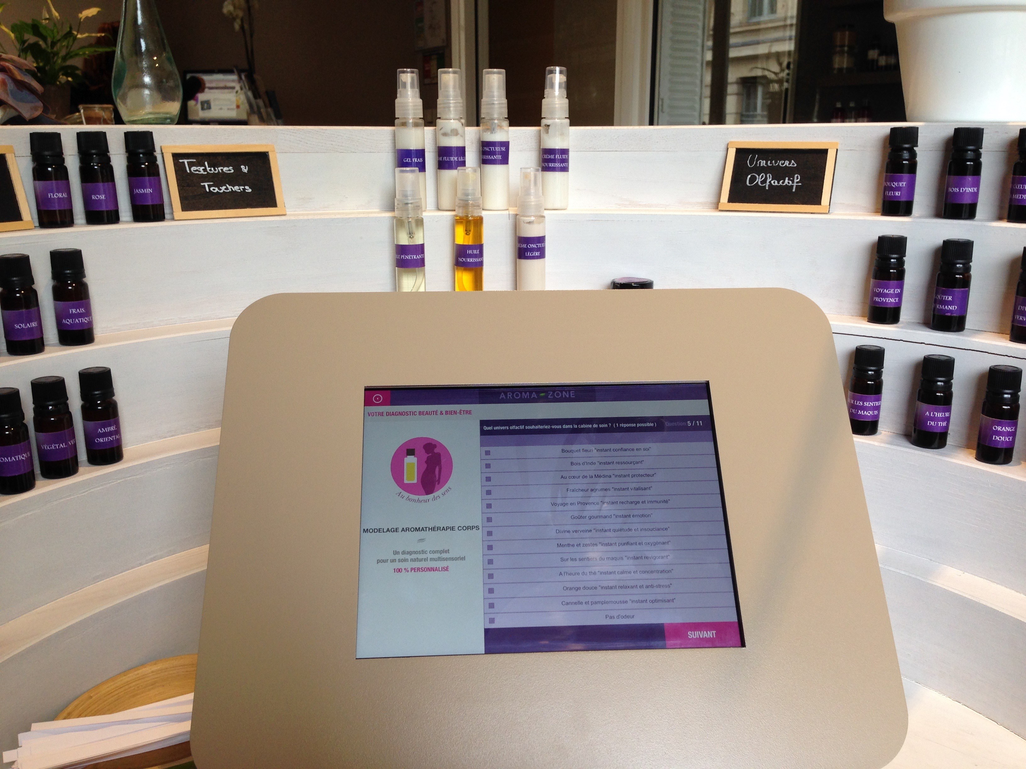 Tout soin chez Aroma-Zone démarre par un questionnaire : une multitude de questions sur son état de santé, ses envies sur l’ambiance parfumée de la cabine, la musique, les pressions, les huiles…. Très complet…. Puis selon sa curiosité, on peut suivre l’esthéticienne dans le labo pour y regarder la préparation sur-mesure des produits qui serviront au soin. Passionnant et très astucieux.