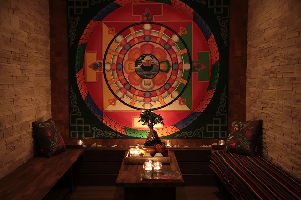 Une fois déshabillée, une jeune tibétaine me convie à rejoindre la cabine située au sous-sol. La décoration y est simple, authentique et élégante. Eclairage aux bougies, présence de bois, des couleurs vertes, beige, et marron réchauffent les murs, où sont accrochés des tableaux, des photos, des peintures venant tout droit du Tibet !