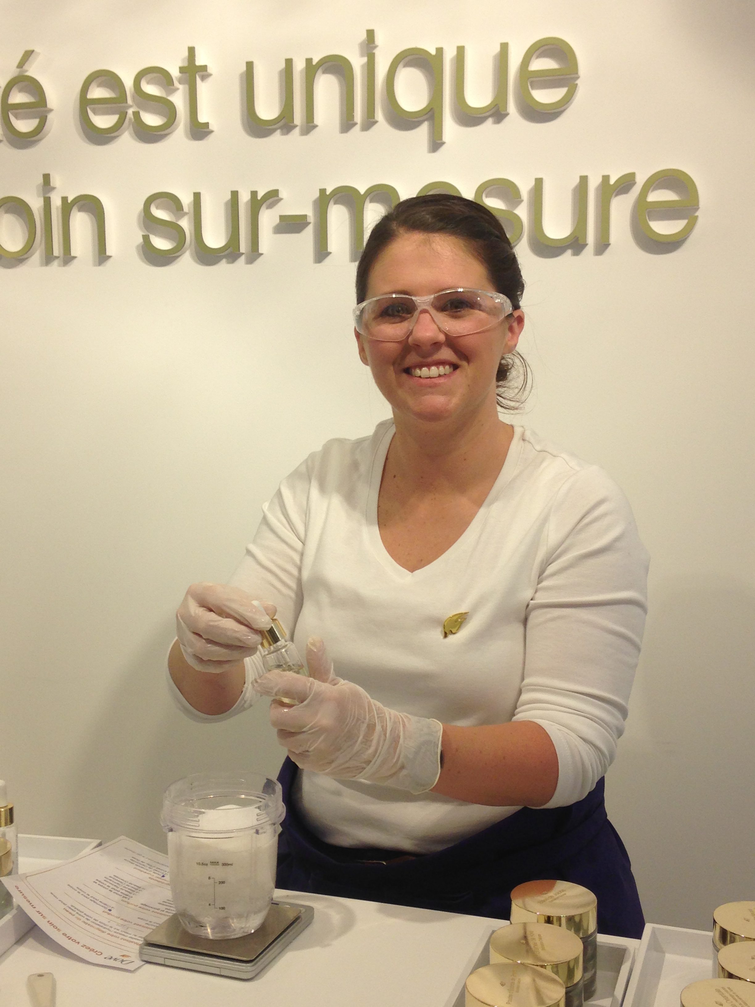 Après un diagnostic de peau, pour mesurer le niveau d’hydratation de ma peau (assez faible), j’ai choisi une crème pour le corps. Une crème plus qu’un lait, car je suis sensible à la texture plus épaisse, plus cocooning d’une crème que d’un lait, trop fluide pour moi. Puis, la conseillère m’a demandé de choisir parmi 5 parfums, des parfums mis au point pour le pop-up store. Mon choix s’est porté celui “d’une beauté exotique”, agrémentée d’agrumes et d’ylang ylang. Puis, j’ai sélectionné la noix de coco pour amplifier le Deepcare Complex afin d’améliorer l’hydratation de ma peau. J’aurai pu aussi choisir un effet scintillant. Si j’avais choisi un gommage, le type d’ingrédient m’aurait été demandé. Enfin, pour personnaliser mon pot de crème, j’y ai fait inscrire “faireletourdumondeenparfums”.