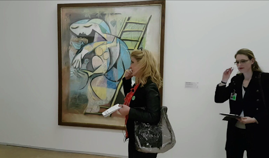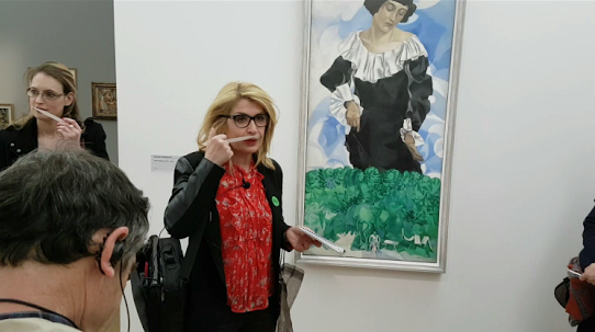 Equipped with ear-phones, so to hear better, we look for the permanent collections of the Pompidou Museum, and we stop in front of Bella au col blanc from Marc Chagall.