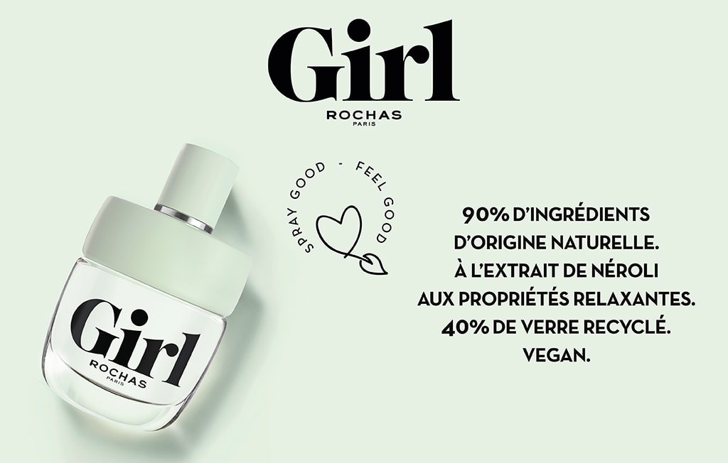 Girl is a fragrance 100% feelgood, designed by Anne Flippo, perfumer at IFF. According to the Rochas brand , Girl would be « an ode to freedom and to well-being, with a vegan formula ; 90% natural which lowers the pressure, thanks to an extract of néroli with relaxing properties, recognized by the neuroscience. It’s a precious ingredient, 100% natural, eco-responsable sourced and traceable. Ultimately, the néroli is supported by an orange flower to increase the well-being , on a base of white woods.