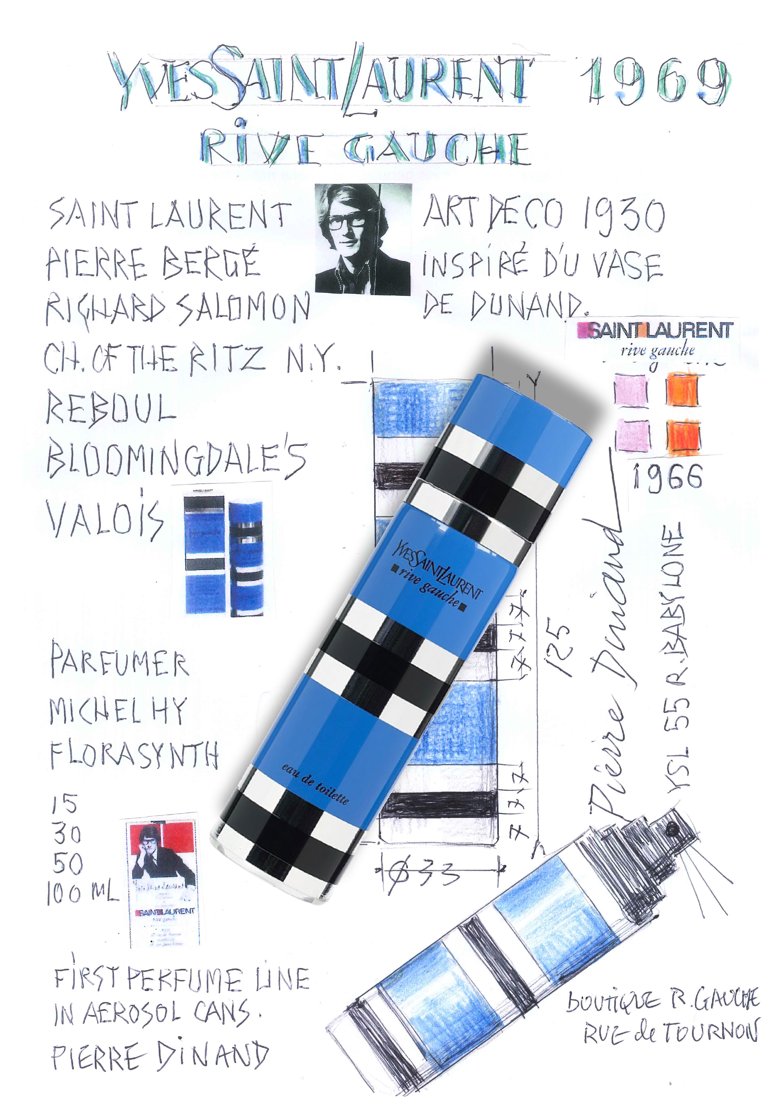 J’ai opté pour l’anecdote de Saint-Laurent Rive Gauche, moins connue que celle d’Opium. Sur les souhaits de Charles of the Ritz, propriétaire de la marque, Pierre s’est inspiré de la célèbre boite de conserve de soupe Campbell, dessinée par Andy Warhol. D’où la boîtier en métal… Quant au décor, Pierre l’a imaginé en bleu, noir et argent d’après un vase Art Déco bleu. Pour la petite histoire, ce vase découvert au marché Biron à St Ouen par Pierre, fut ensuite acheté par Yves Saint-Laurent et Pierre Bergé ! Ce flacon n’a d’ailleurs pas pris une ride, puisqu’il est toujours en vente aujourd’hui… incroyable et admirable de nos jours. Ce parfum a été conçu par les parfumeurs Michel Hy et Jacques Polge à l’époque chez Roure.