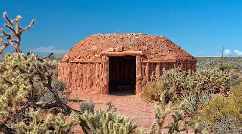 Dans la culture des navajos, la maison “le hogan” est construite en terre, revêtant plusieurs formes, même si elle garde souvent un aspect circulaire. En réalité, cette maison est construite dans un esprit d’harmonie, l’hozho. Plus précisément, le toit évoque le ciel, les murs expriment ce qui nous entourent (en écho à la position droite des montagnes et des arbres) et le sol est en relation avec la terre mère. Une fois terminée, le chaman bénit la maison depuis les 4 directions !