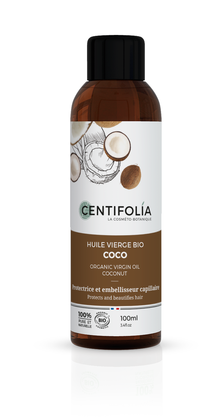 L’huile de noix de coco de Centifolia : Elle est 100% naturelle, bio et sans conservateur. C’est une huile vierge obtenue par première pression à froid des noix de coco fraîches.