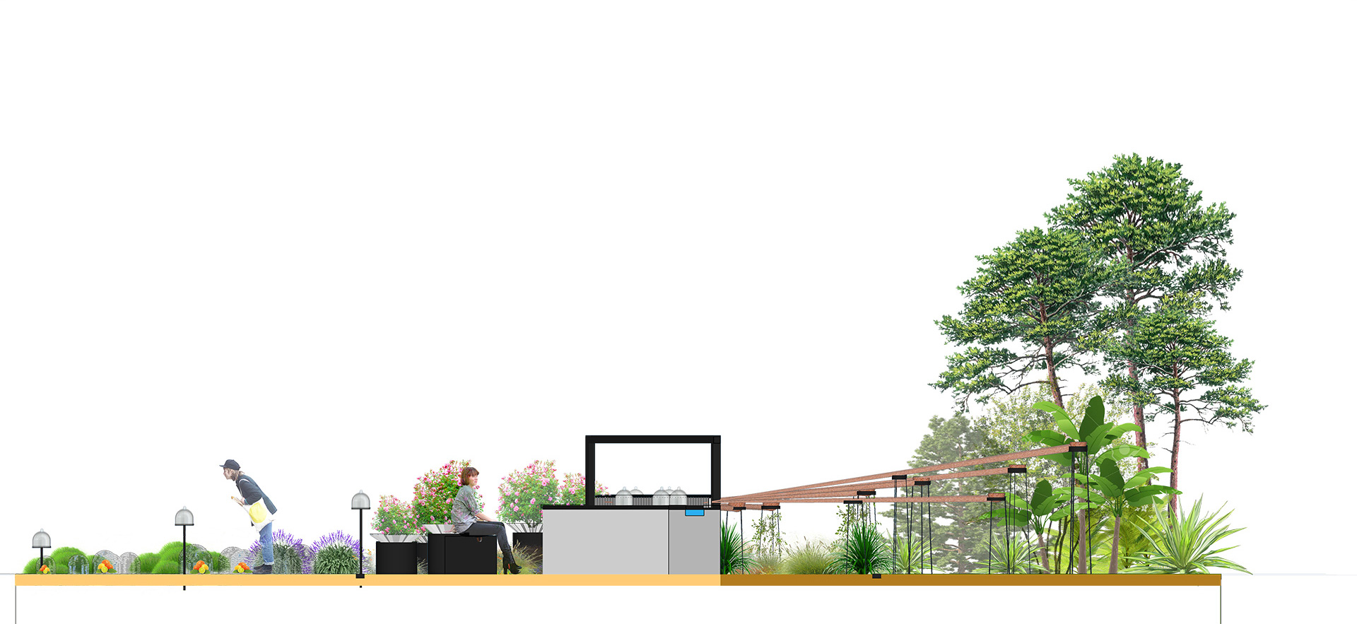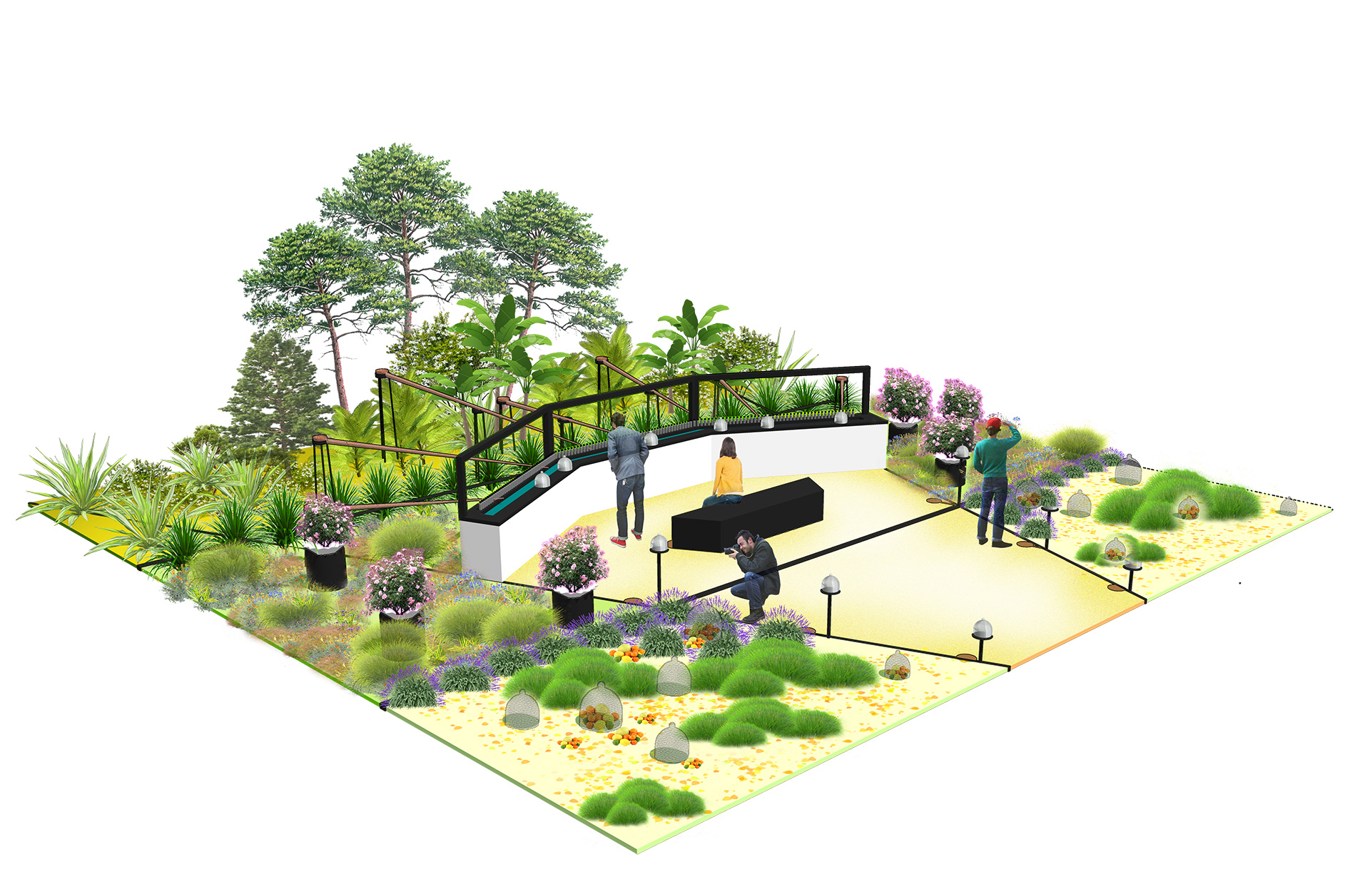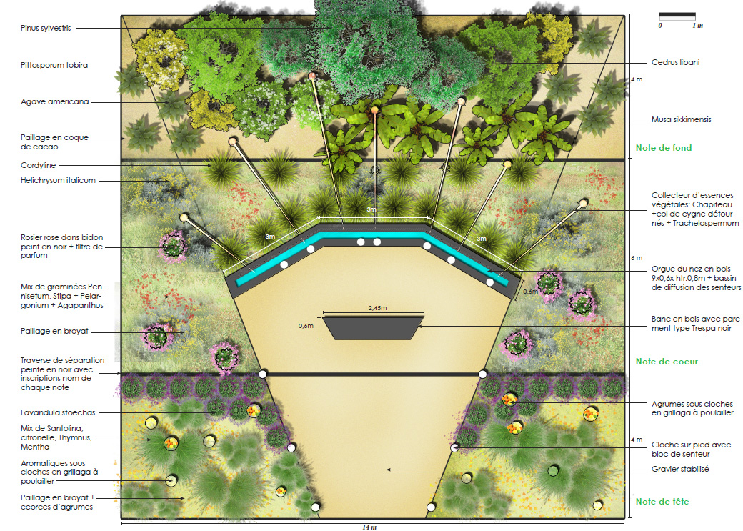 Tout naturellement, c’est par la note de tête que l’on pénètre, avec des agrumes, des plantes aromatiques, telles Ce sont les plantes aromatiques et les agrumes qui sont placés sous des cloches en grillage. Puis, au fil du temps, le visiteur poursuivra sur la note de coeur et, sur l’orgue à parfum avant d’arriver sur la note de fond. Ce sont des arbres qui illustrent le fond du parfum composé de senteurs boisées. Dans ce jardin, l’homme est spectateur et le parfum évolue au fil du temps.