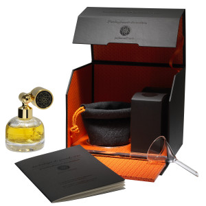 - un flacon rechargeable en cristal (soufflé bouche) millésimé et numéroté avec au choix une pompe plaqué or ou palladium. Ce flacon est une création spéciale Marcel Franck