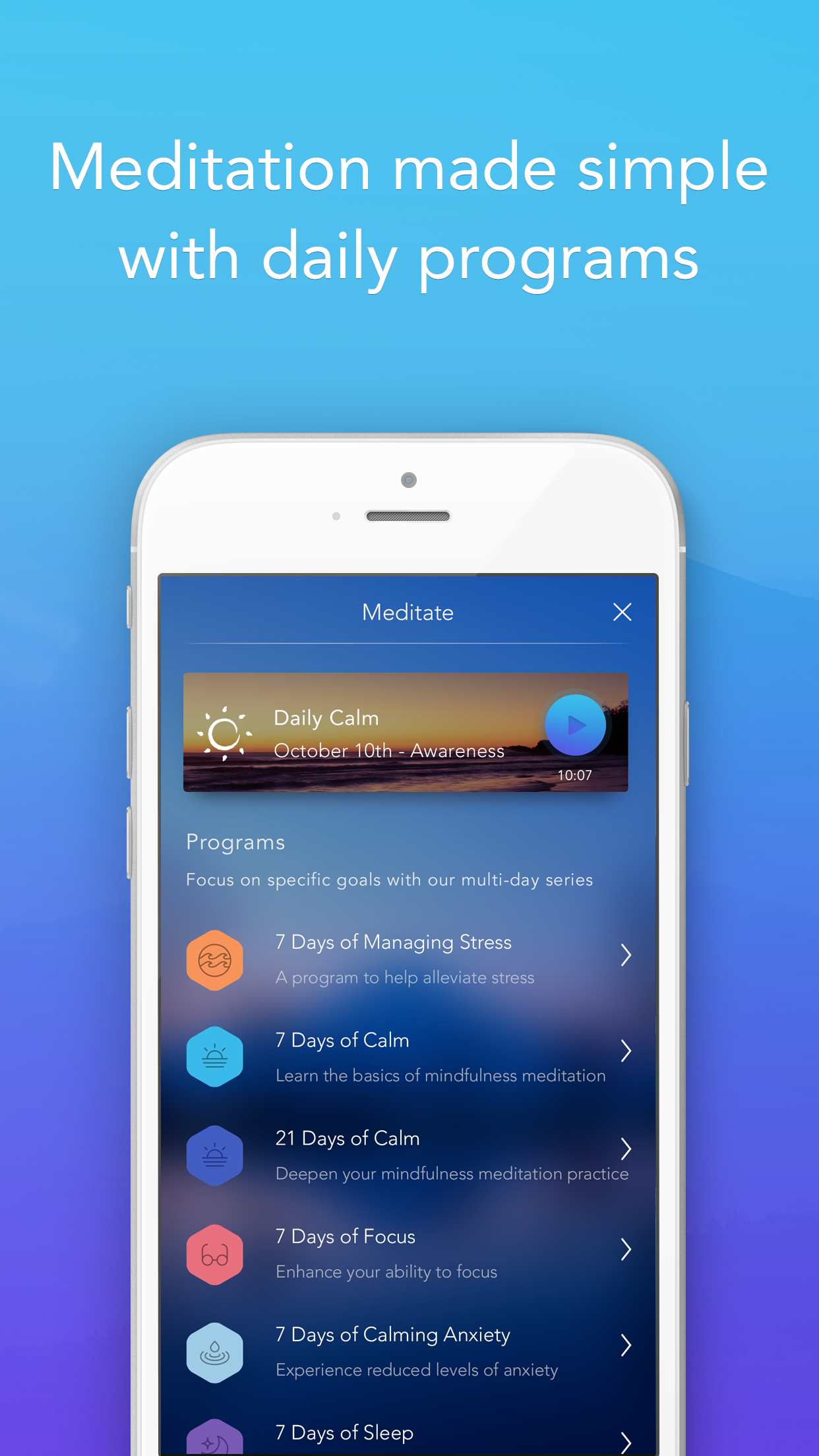 Ma deuxième application pour méditer est aussi anglaise et s’appelle Calm. Là, ce sont des voies féminines qui conduisent les méditations. L’idée reste la même, à savoir permettre d’être plus heureux et plus calme par le biais méditation et de la relaxation. Les programmes de Calm sont différents et proposent une série de méditation de 12 minutes par jour sur des thématiques telles gratitude, combattre l’anxiété, se concentrer, être plus heureux, voire même un programme pour le soir avec des méditations pour se détendre et plus dormir. Fabuleux, je suis devenue une adepte.
