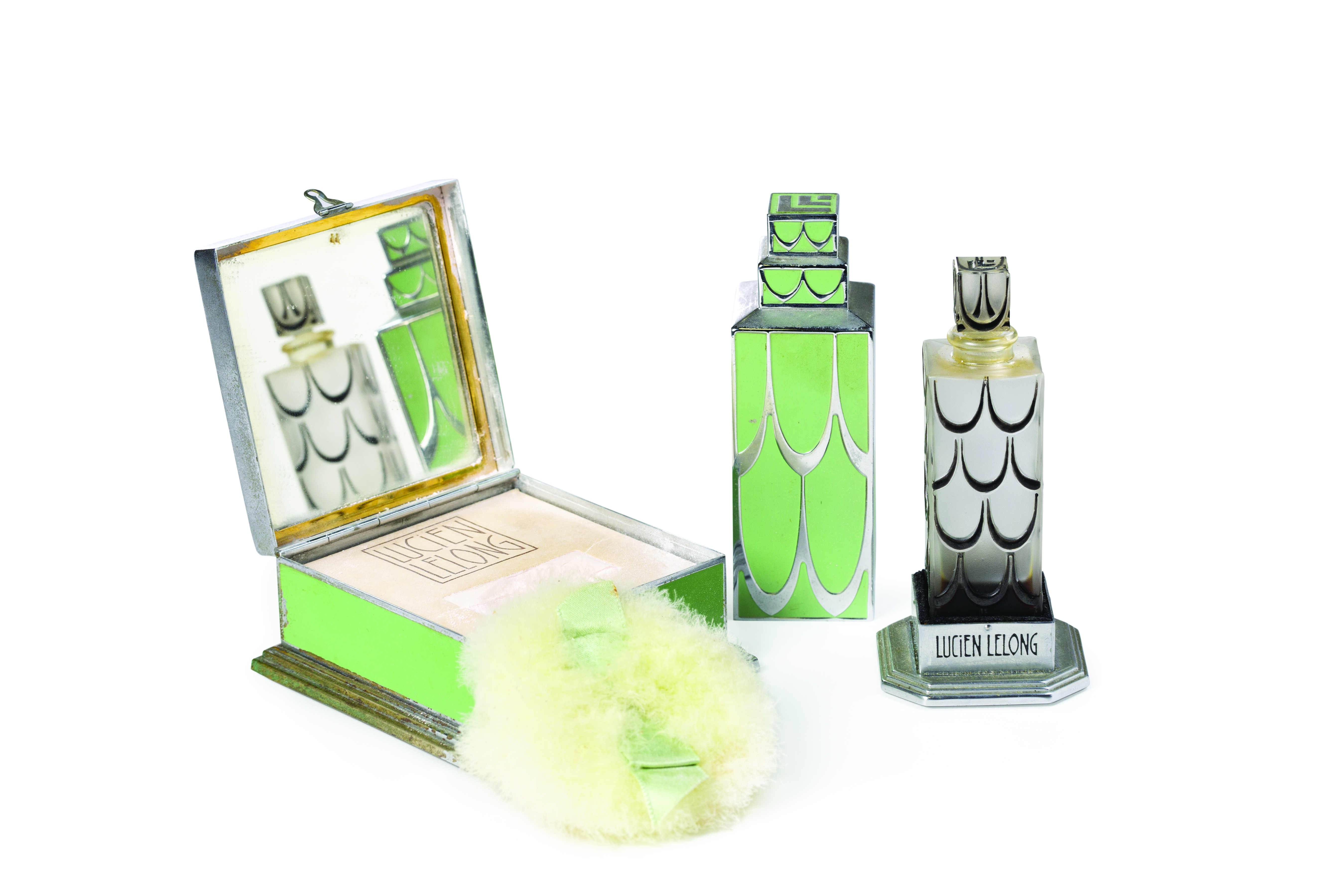 Flacon et boite à poudre pour Lelong (c) K. Faby – Coll. Benjamin Gastaud – Modèle crée 1929 – Verre soufflé-moulé, émaillé, bouchon moulé-pressé émaillé, métal émaillé