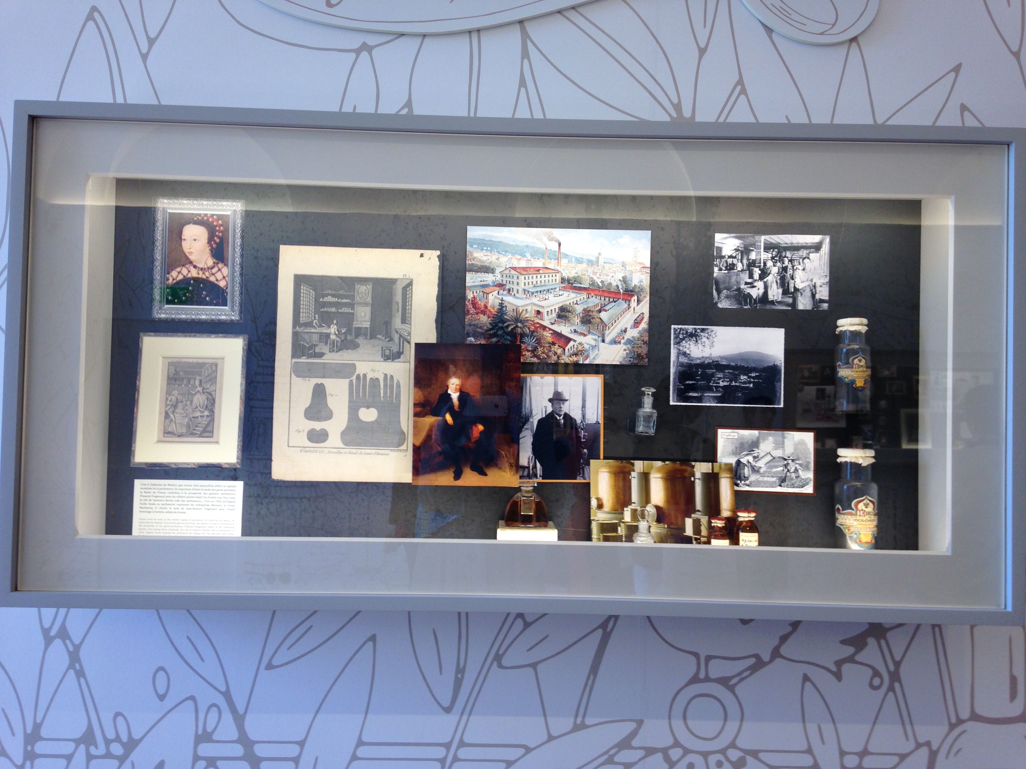 Sur un papier peint, reprenant les différents flacons Fragonard au monochrome de gris, ce sont jolies vitrines qui retracent l’histoire de la maison Fragonard, agrémentés d’objets, de papiers, de publicités, de photos, qui parlent d’eux mêmes. Le tout choisi et pensé par Jean Hueges, directeur artistique de la marque.