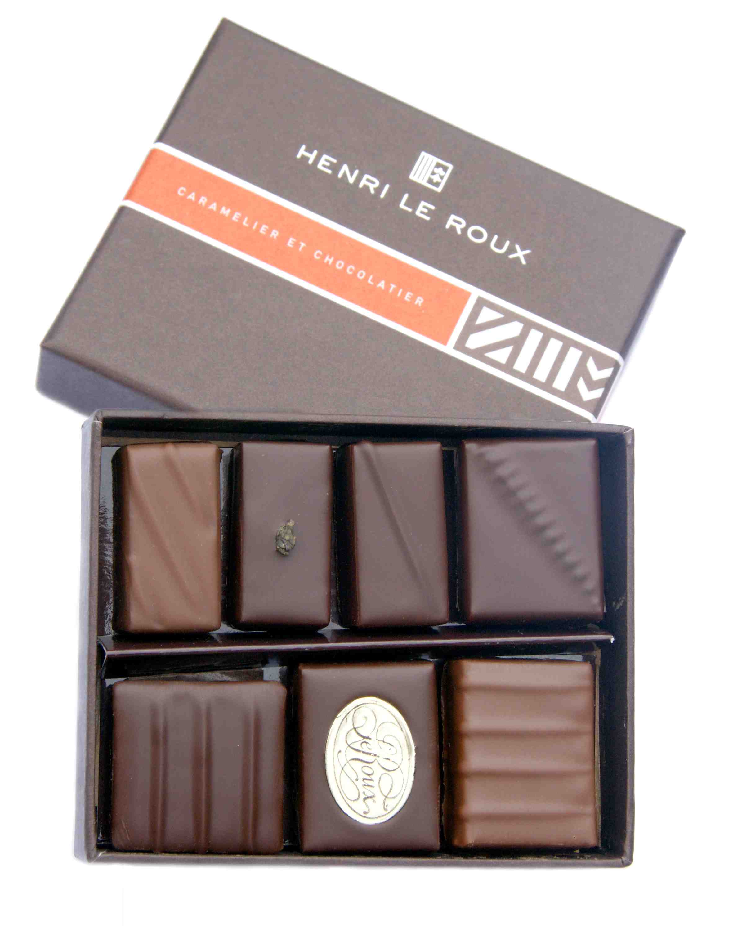 Cette petite boîte pour découvrir la richesse des chocolats Henri le Roux, contient C.B.S. enrobé d’un chocolat noir, Sarasinne, une Ganache à l’infusion de blé noir, Yannick, un Gianduja et crêpes dentelle, P’tit déj lait, un Praliné feuilleté au café et crêpes dentelle, Soizig, un Praliné et crumble blé noir, à la fleur de sel de Guérande et Ganaka, une Ganache au caramel.