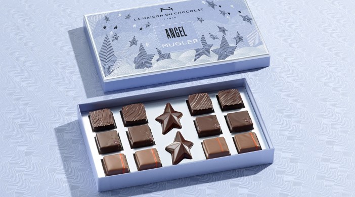 Enfin, j’ai goûté à nouveau, deux chocolats de la belle boîte sur le parfum Angel de Thierry Mugler : celui aux agrumes faisant écho aux notes de tête du parfum et celui à la barbe à papa & fruits rouges. L’un comme l’autre sont intéressants et délicieux. Dans le premier, je trouve que l’alliance d’une fine couche de gélatine aux agrumes, associée au chocolat est plus puissante et plus intéressante, qu’une ganache parfumée aux huiles essentielles. Par contre, l’arôme qui se dégage de la barbe à papa vous transporte dans l’ambiance des fêtes foraines et de la gourmandise avec les fruits rouges. Une belle réussite, cette boîte de chocolats avec les parfums Thierry Mugler. Ne manquez pas le chocolat au patchouli….