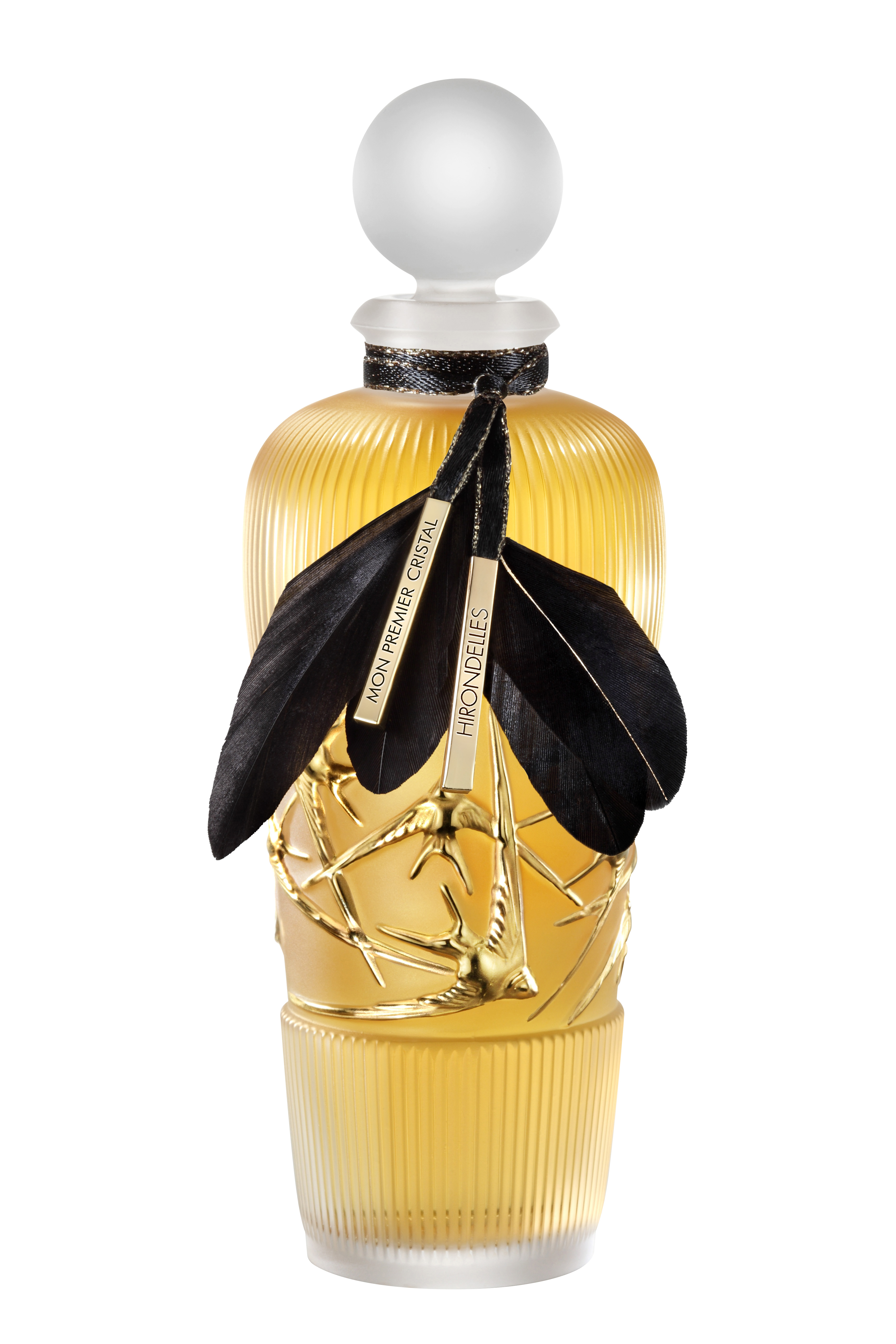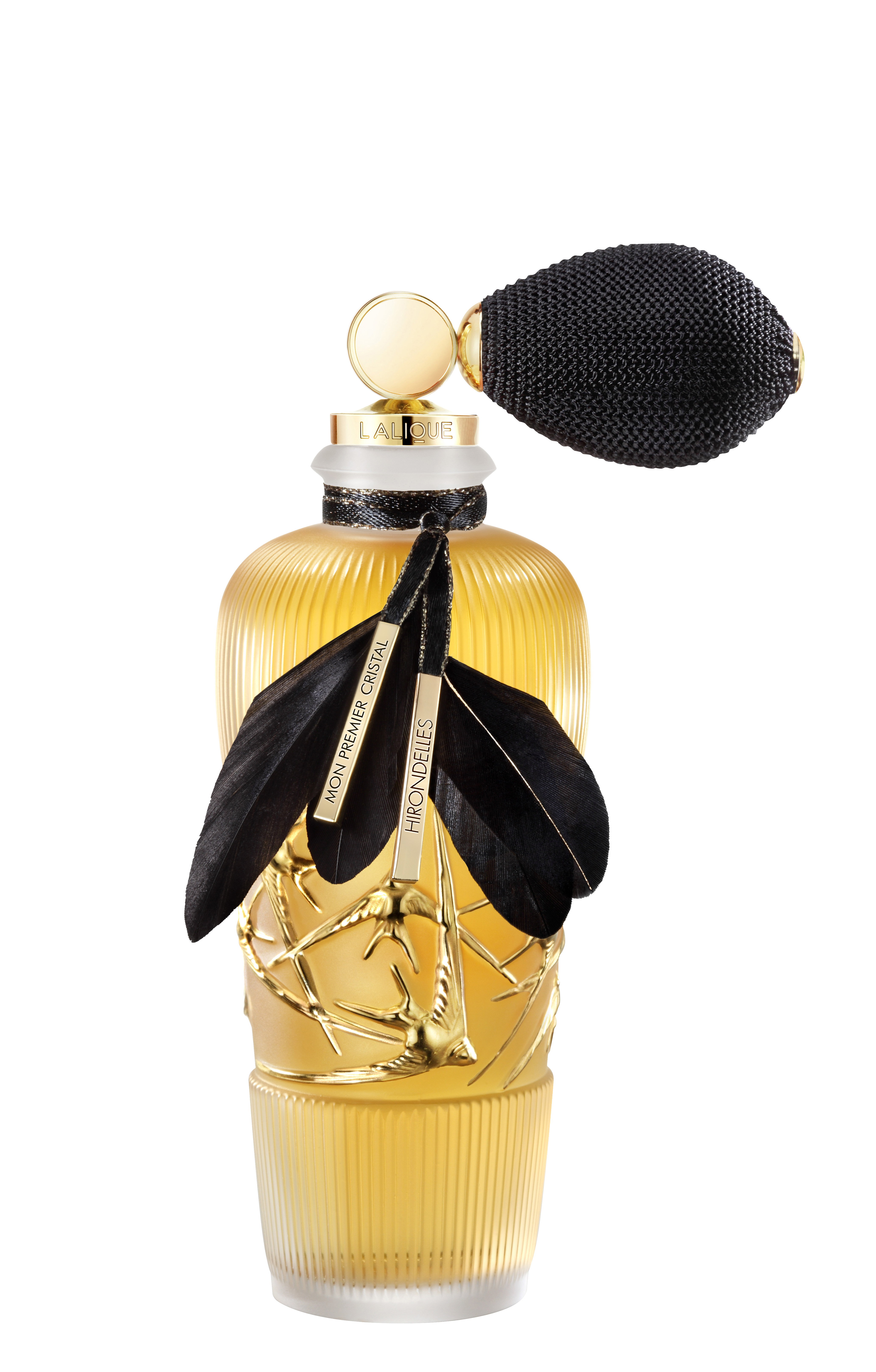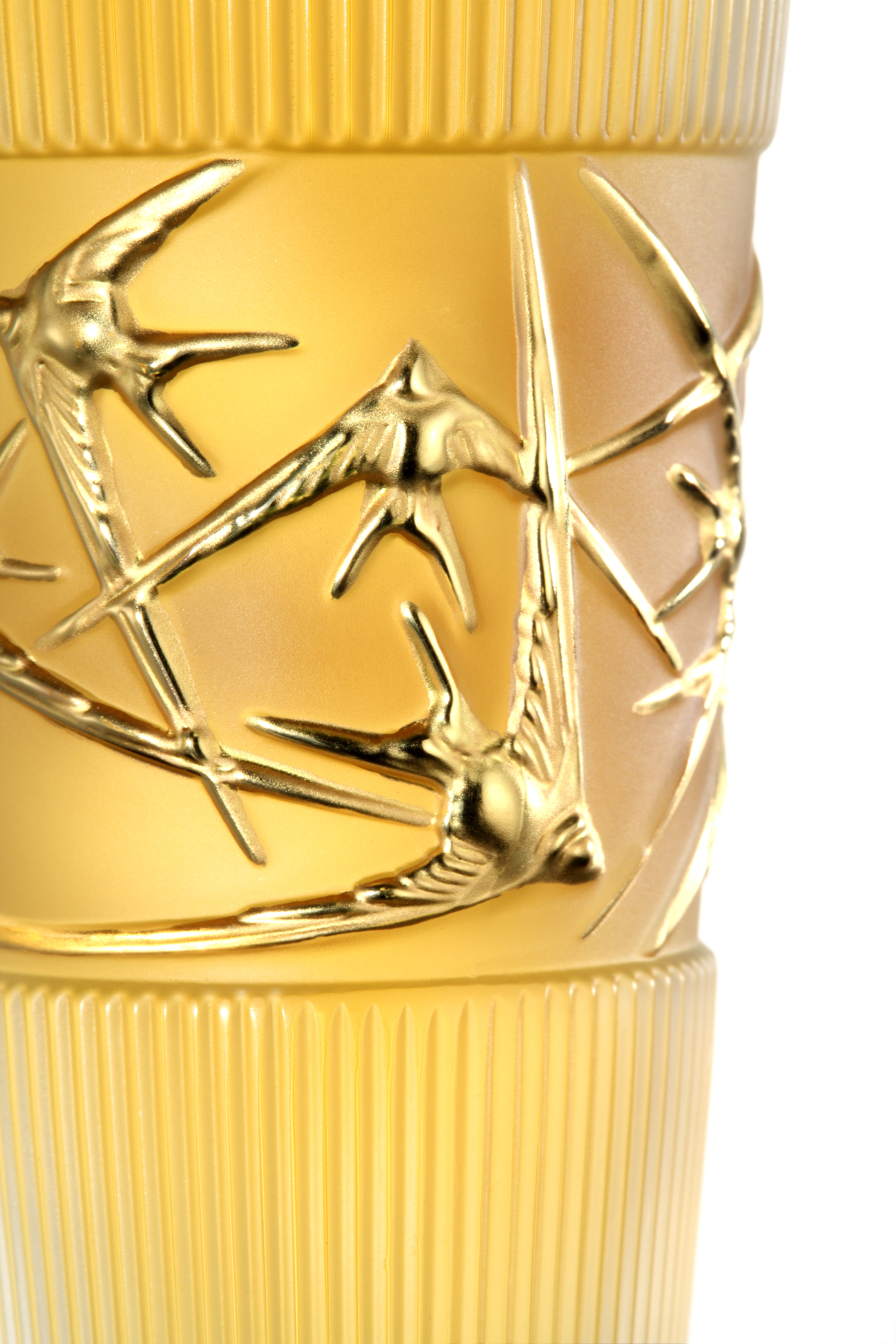 Pour fêter les 130 ans de création de la Maison Lalique, cette dernière a conçu une fois de plus, un superbe flacon en cristal. Un flacon décoré d’hirondelles, l’emblème Lalique. Ces oiseaux sont dorés à l’or 23 carats, qui est déposé au pinceau. Sans oublier les ailes d’hirondelles noires qui viennent rehausser le superbe flacon.