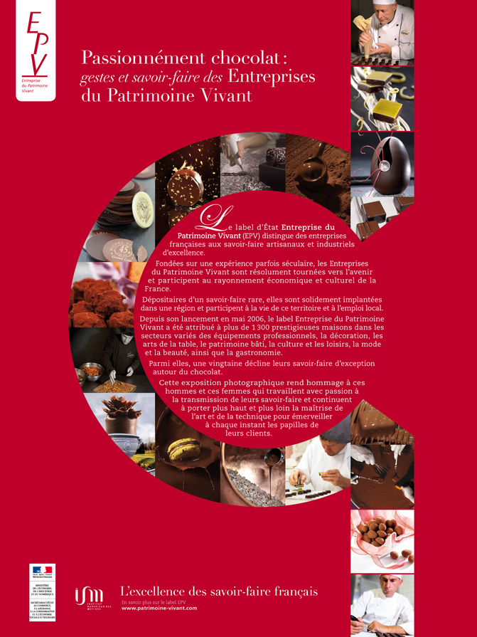 En avant-première de la Fête de la Gastronomie, une exposition de photos sur le chocolat, « Passionnément chocolat : gestes et savoir-faire des Entreprises du Patrimoine Vivant », démarre du 26 septembre au 24 octobre 2014, à la Galerie de La Cornue, au 54 rue de Bourgogne. Ces photos illustrent les talents d’excellence des Entreprises du Patrimoine Vivant (EPV).