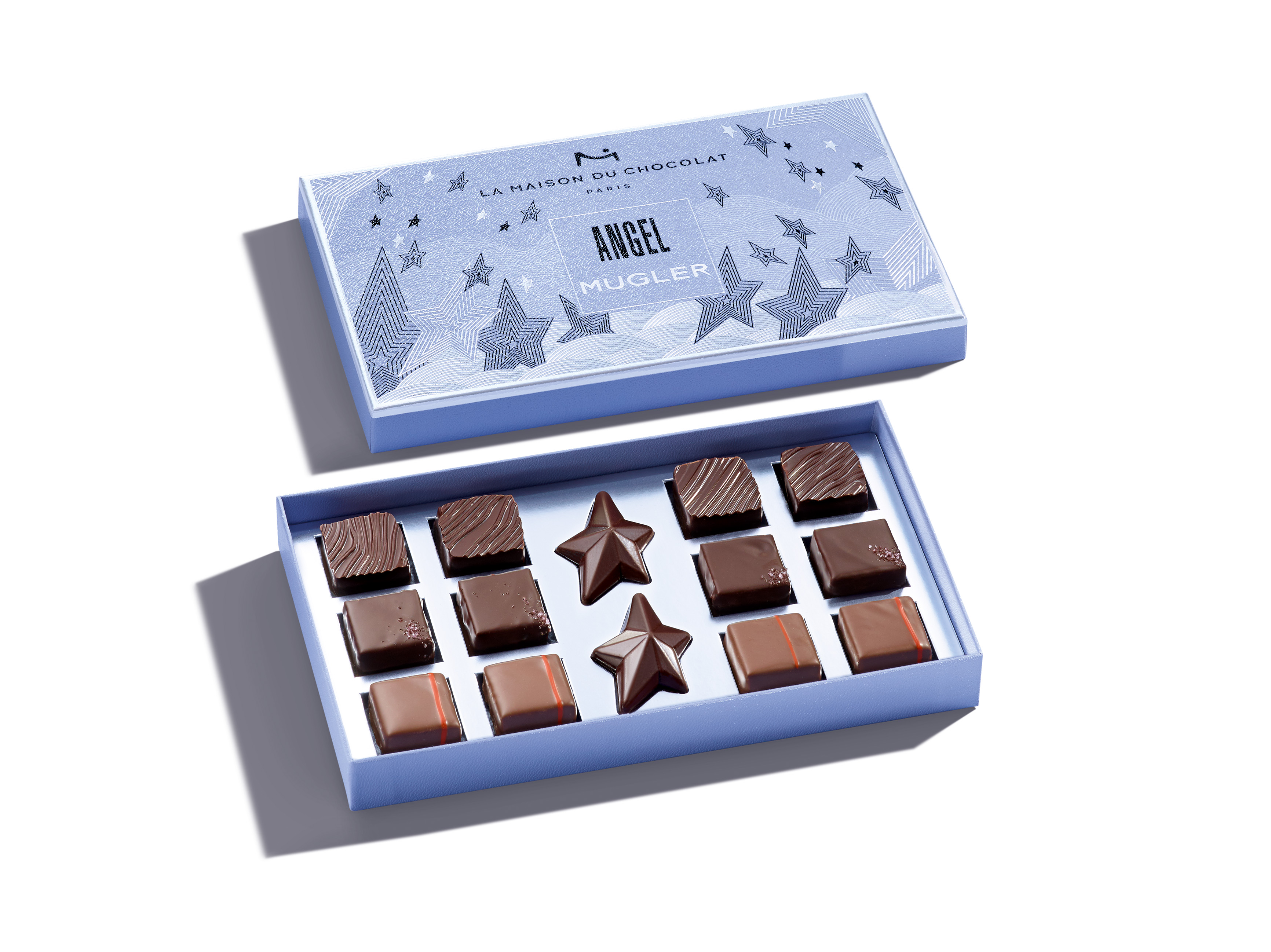 Cette boîte Angel Mugler contient 12 chocolats et 2 étoiles en chocolat, est vendue au prix de 25€ dans les boutiques de La Maison du Chocolat.