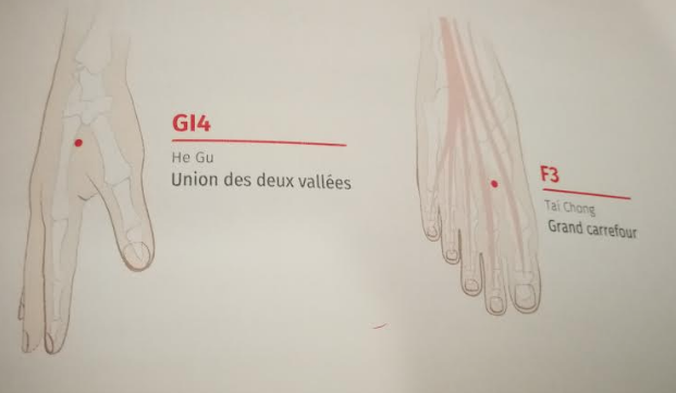 - Soulager le mal de tête : il faut stimuler le point Union des 2 vallées (G14), le point Grand carrefour (F3)