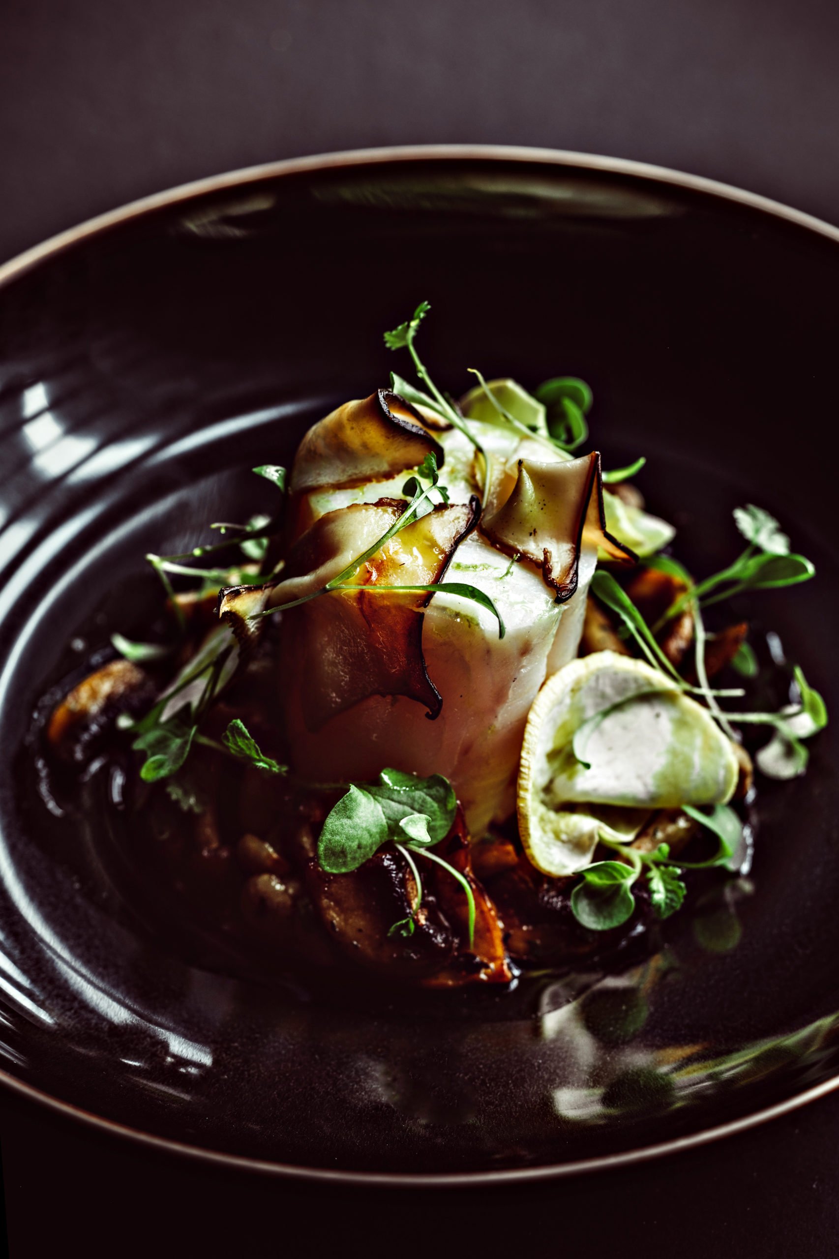 Cabillaud cuit à l’huile de coco (ou huile d’olive), sauce aux champignons, curcuma et gingembre de Thomas Danigo chez Monsieur George