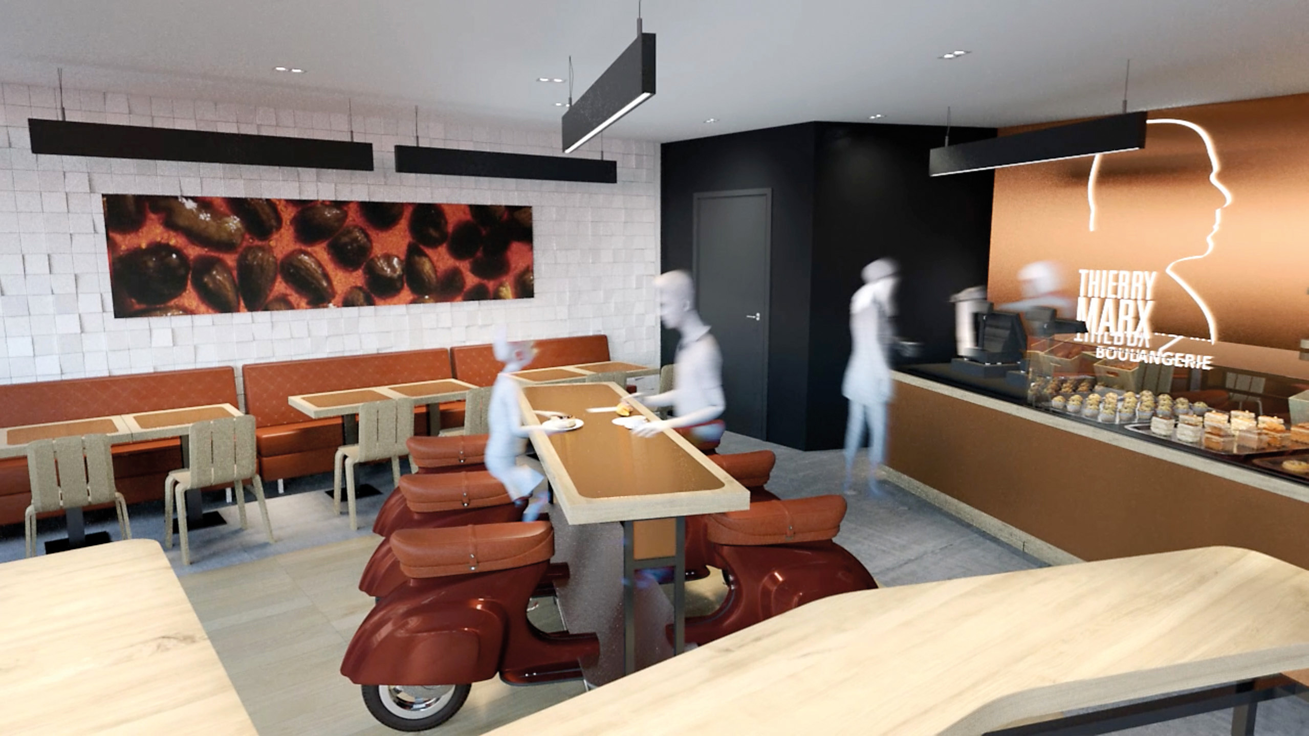 Pénétrer dans la boulangerie de Thierry Marx, c’est rentrer chez lui et le connaître. Qui mieux que Mathilde de l’Ecotais (sa femme) pour mettre en scène son univers ? Partie d’une page blanche, elle a choisi le noir, la couleur favorite de Thierry, le bois clair, chaleureux et authentique, le cuivre qu’il affectionne et la table d’hôte entourée de fauteuils scooter, le véhicule de tous les jours du chef. Dans ce décor convivial et épuré, le pain reste l’acteur principal !