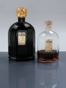 Ce sont deux flacons créés et édités par les Verreries H Saumont à Nogent L’Artaud. L’un des flacons est en verre opaque, noir, pressé, moulé de section ovale cylindrique avec des rainures. Son bouchon carré laqué à l’or représente une grappe de raisin. Son étiquette argentée et illustrée a été réalisée par Marcel Pautot, sculpteur, dessinateur d’origine grassoise. H 26 cm x 20,5 cm.
