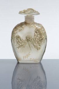 Le flacon est en verre incolore avec un motif central à décor moulé en creux d’un faune embrassant une naiade avec son bouchon perle. Crée et édité par René Lalique, signé dans la masse. Ce dernier a reçu la médaille d’or du jury de l’Exposition International de New York en 1939.