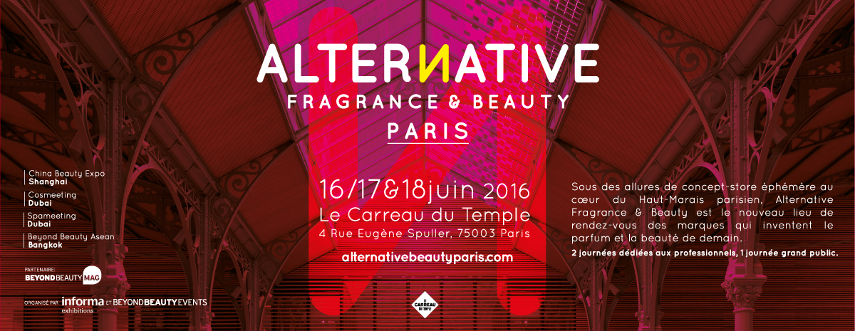 Sous des allures de concept-store éphémère au cœur du Haut-Marais parisien, Alternative Fragrance & Beauty réunit 100 marques de cosmétique et parfumerie alternatives, triées sur le volet, dans une scénographie insolite. Pour en savoir plus, cliquez ici. Le samedi 18 juin 2016 est une journée ouverte au grand public de 11h à 20h au prix de 12€ l’entrée.