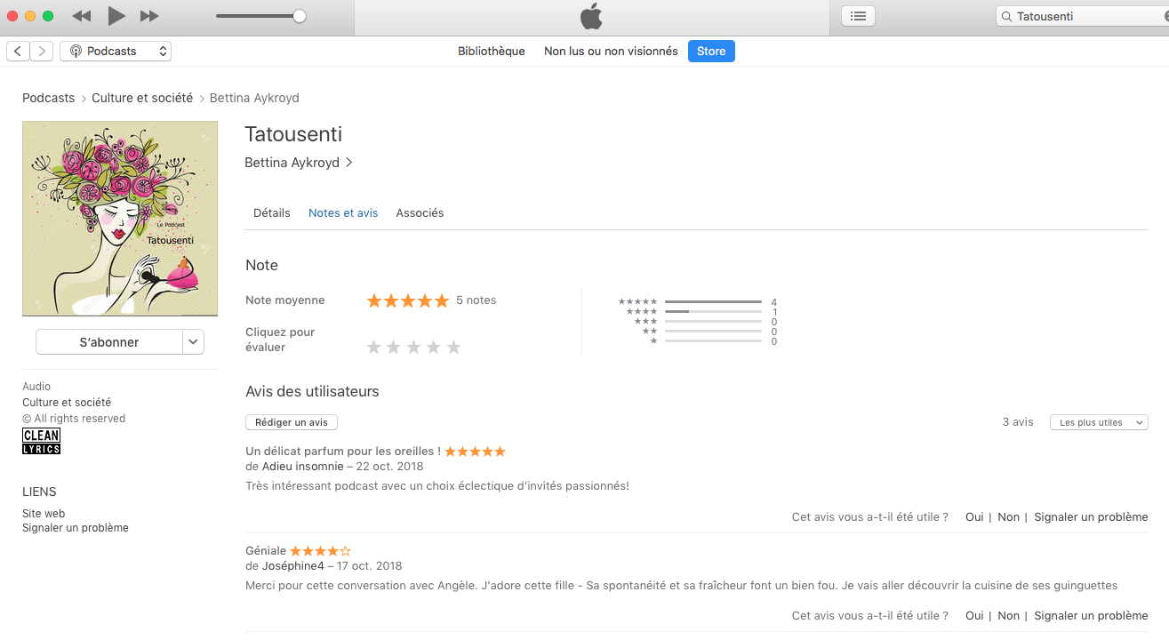 Si le podcast Tatousenti vous plaît, la meilleure façon de le soutenir est d’écrire un commentaire sur iTunes : c’est ce qui permettra à d’autres de le découvrir ! C’est ainsi que le site devient visible au coeur de l’Apple store afin d’en écouter encore plus !… Voici la marche à suivre à l’aide des captures d’écran. Il vous suffit donc de suivre la description….